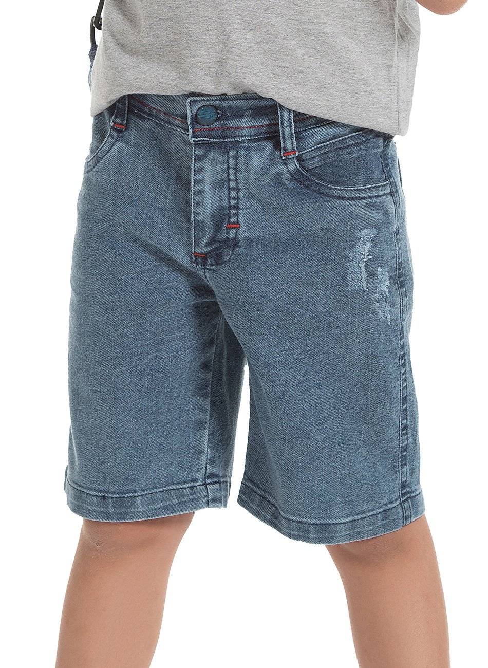 Bermuda Jeans Destroyed Infantil Masculina da renomada marca Trajadinhos. Projetada para oferecer um estilo despojado e moderno, esta bermuda combina conforto com tendências atuais, tornando-a perfeita para o guarda-roupa dos seus pequenos.