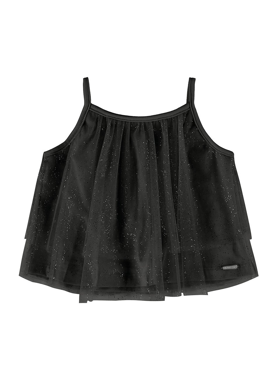 O detalhe das alças é um charme adicional, destacando o design moderno e elegante da blusa. A combinação do brilho do tule com o conforto do cotton garante que sua filha fique confortável e estilosa durante todo o uso. Com acabamento de alta qualidade e design moderno, esta blusa é a escolha perfeita para meninas que adoram se destacar com sofisticação.