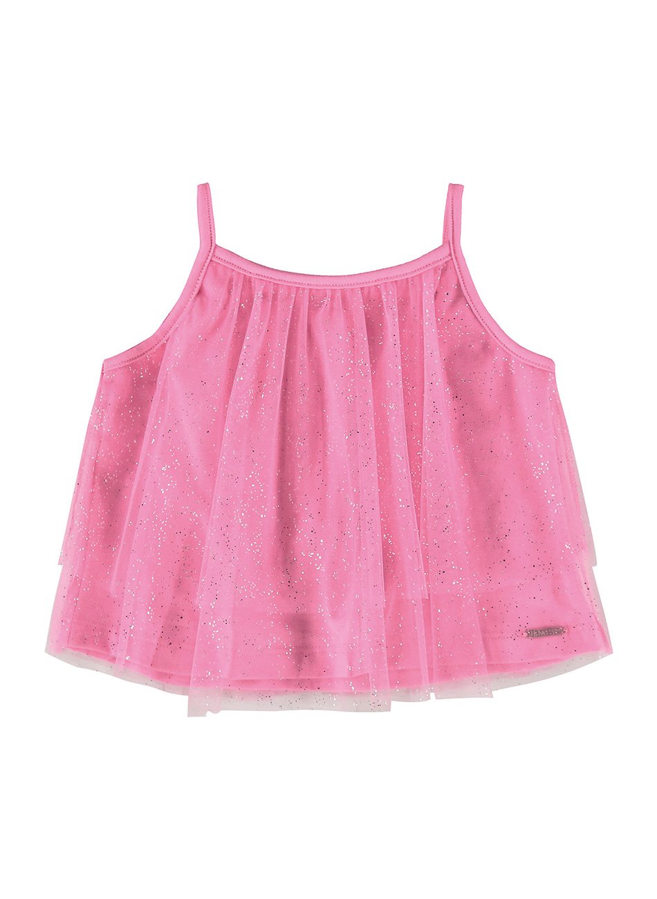 O detalhe das alças é um charme adicional, destacando o design moderno e elegante da blusa. A combinação do brilho do tule com o conforto do cotton garante que sua filha fique confortável e estilosa durante todo o uso. Com acabamento de alta qualidade e design moderno, esta blusa é a escolha perfeita para meninas que adoram se destacar com sofisticação.