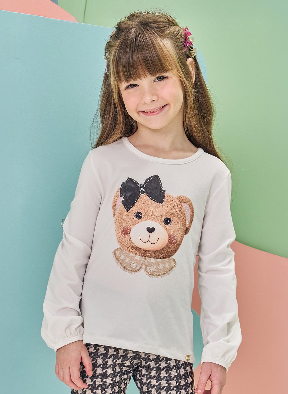 Blusa em Malha Comfy Infantil menina Kukiê A blusa infantil menina Kukiê é a escolha perfeita para as pequenas fashionistas! Confeccionada em malha comfy, essa blusa garante estilo e conforto para a sua pequena. Com estampa divertida de ursinho com laço, essa blusa é perfeita para brincar, passear ou até mesmo para um evento mais casual. O tecido leve e macio proporciona conforto e liberdade de movimentos, enquanto o design moderno e divertido permite criar looks incríveis para o dia a dia.