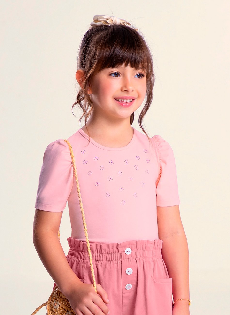 Além de ser elegante, esta blusa é extremamente versátil. Pode ser combinada facilmente com saias, shorts ou calças, adaptando-se a diferentes ocasiões, seja para um passeio casual ou um evento especial. O aplique de strass garante que sua filha se destaque com estilo onde quer que vá.