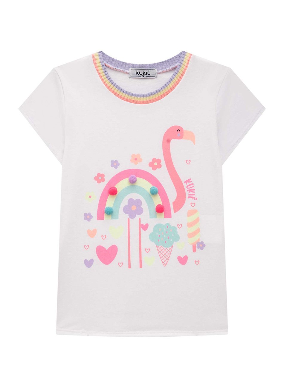 Esta blusa alongada da Kukiê possui um detalhe colorido na gola, que adiciona um toque de alegria e diversão ao design. Na parte da frente, a estampa é adornada com mini pompons coloridos, criando um visual encantador e lúdico que sua criança vai adorar.
