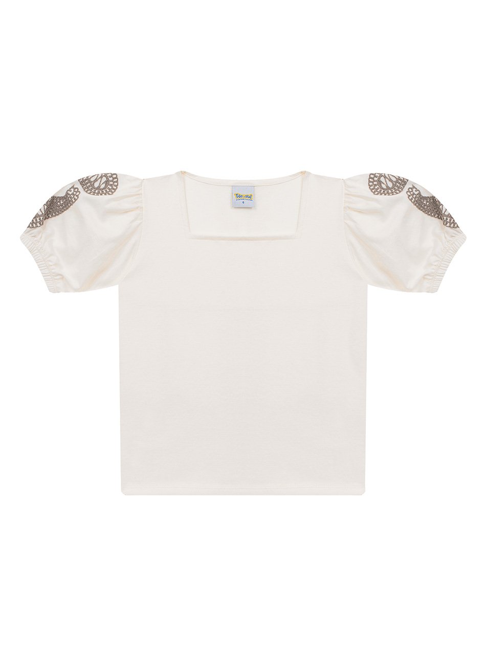 O charme desta blusa está nos detalhes do bordado nas mangas, que adicionam um toque de delicadeza e sofisticação ao design. A gola reta traz um visual clássico e elegante, que completa a peça com um toque de modernidade. Versátil, esta blusa pode ser combinada com jeans, saias ou shorts, criando looks encantadores para diversas ocasiões.