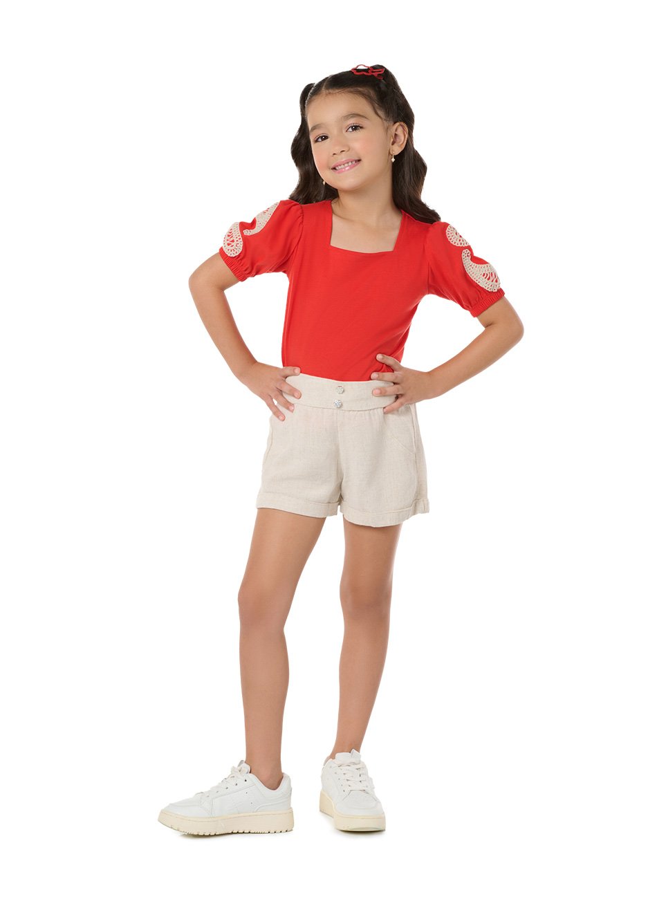 O charme desta blusa está nos detalhes do bordado nas mangas, que adicionam um toque de delicadeza e sofisticação ao design. A gola reta traz um visual clássico e elegante, que completa a peça com um toque de modernidade. Versátil, esta blusa pode ser combinada com jeans, saias ou shorts, criando looks encantadores para diversas ocasiões.