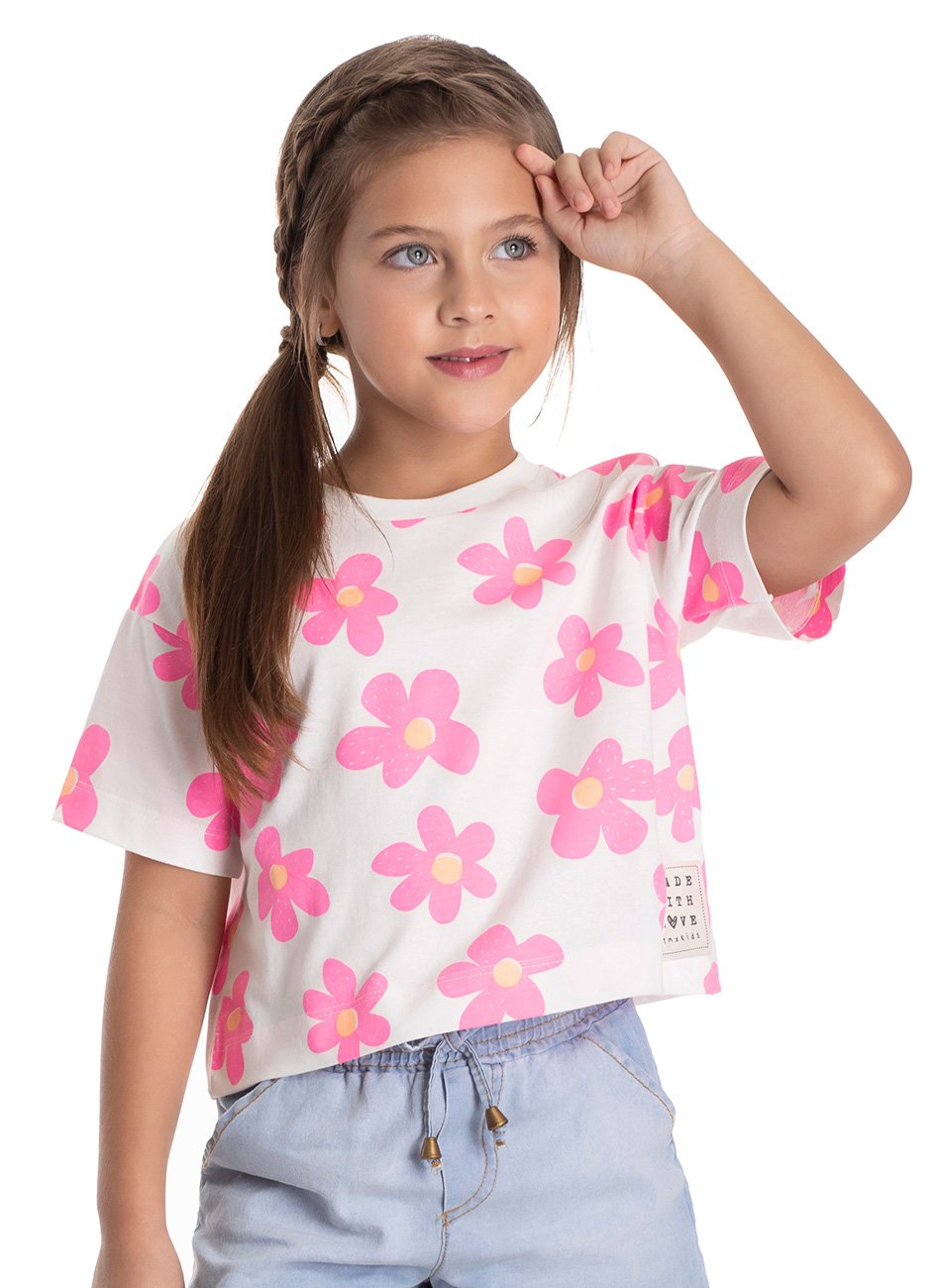 O destaque desta blusa é sua estampa floral encantadora, que adiciona um toque especial e feminino à peça. A estampa é complementada por uma etiqueta estampada na parte da frente, que confere um detalhe autêntico e exclusivo. Seja combinada com jeans, saias ou shorts, esta blusa se adapta a diferentes estilos e ocasiões, garantindo sempre um visual moderno e despojado para as meninas.