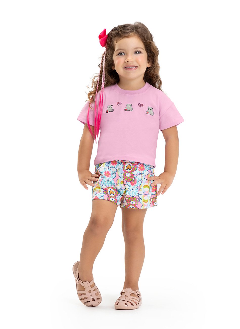 O shorts em moletinho complementa o conjunto com uma estampa rotativa, que traz dinamismo e alegria ao visual. Feito de um tecido leve e macio, o shorts oferece liberdade de movimento, permitindo que as meninas brinquem e se movimentem com facilidade e conforto. A estampa rotativa garante um design único e divertido.