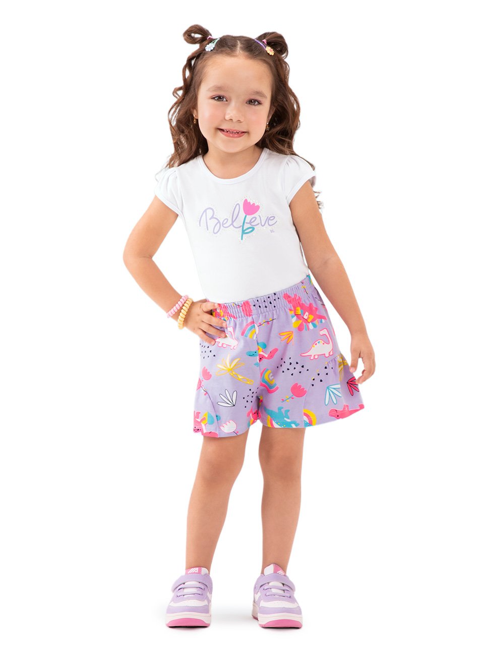 O destaque do conjunto fica por conta da estampa encantadora com aplicação de strass, que adiciona um brilho delicado ao visual, deixando sua pequena ainda mais charmosa. O shorts, por sua vez, complementa a peça com uma estampa rotativa moderna e vibrante, garantindo um look harmonioso e cheio de personalidade.
