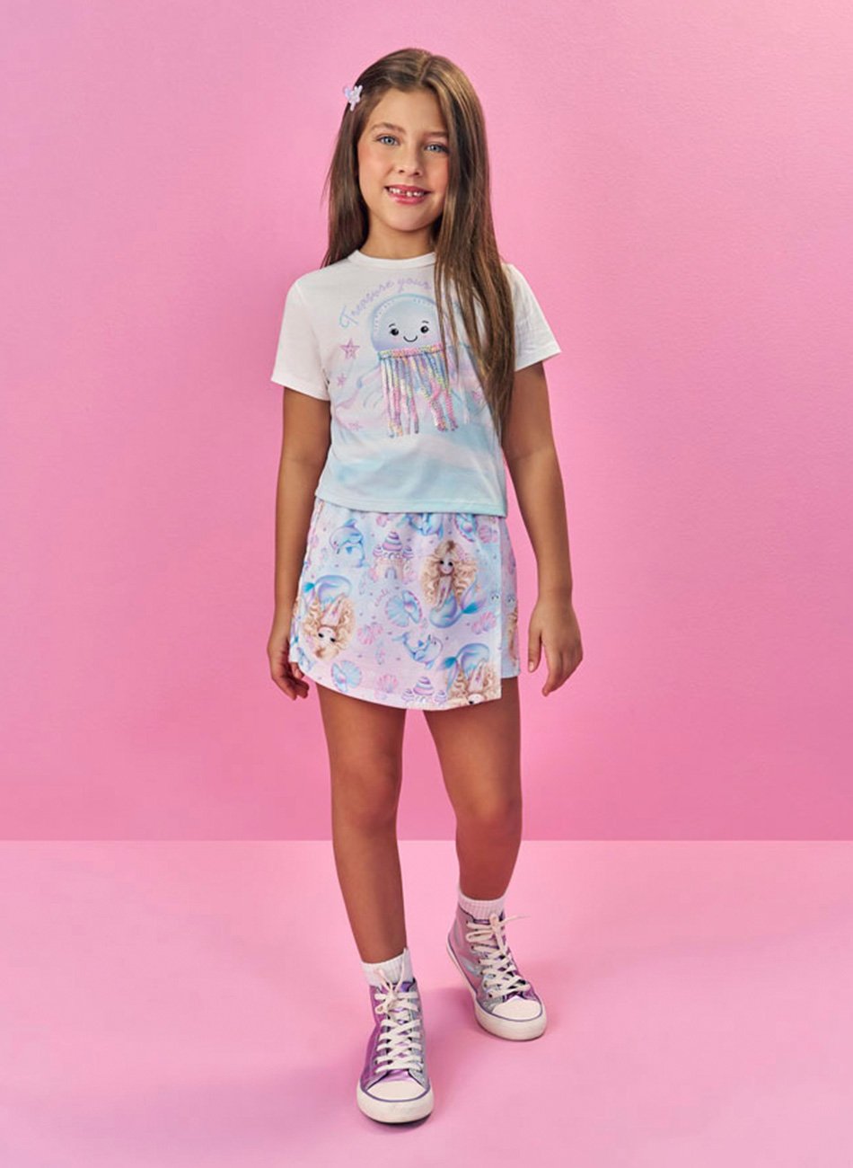 Conjunto Infantil Feminino da Cinti é a combinação perfeita entre conforto e modernidade para os momentos de lazer e diversão. Composto por uma blusa boxy com estampa frontal divertida e um shorts saia em molecotton light com estampa rotativa, ele é ideal para as meninas que adoram um look leve, estiloso e cheio de atitude.