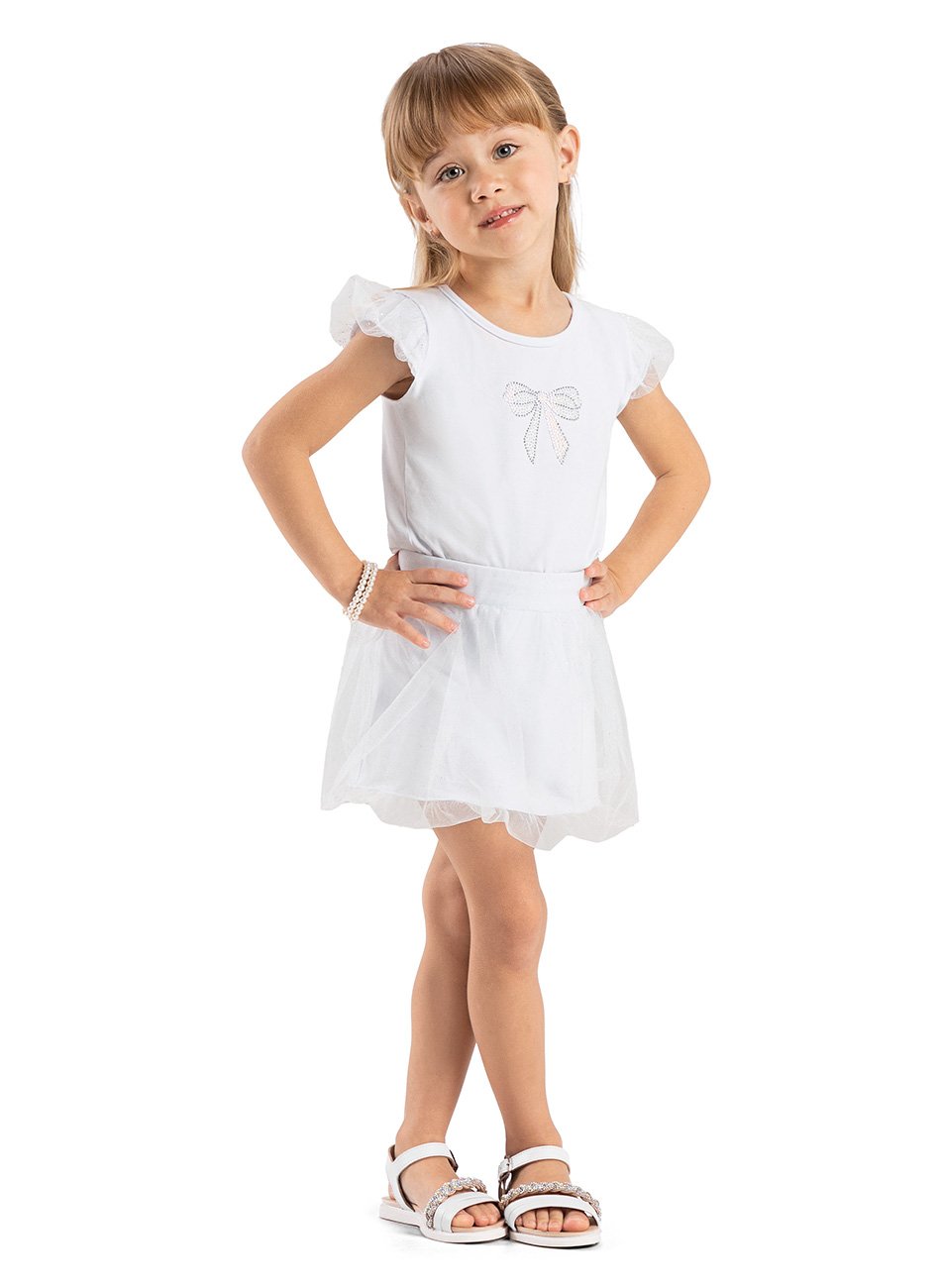 A saia de tule com camadas delicadas adiciona volume e leveza ao conjunto, criando um efeito encantador. O short saia garante conforto e liberdade de movimento, permitindo que a menina aproveite a festa com elegância e praticidade. Este conjunto é ideal para ocasiões como aniversários, festas e celebrações, combinando estilo e conforto em uma única peça.