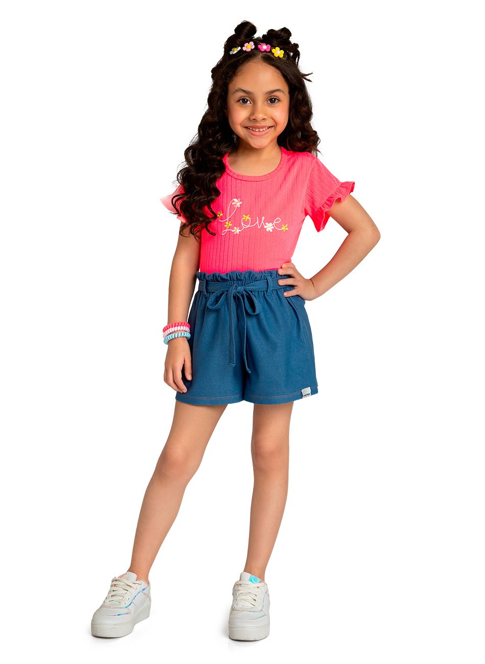 Conjunto Blusa Canelada e Shorts Molecotton Jeans Infantil Menina da Marlan é a escolha perfeita para as meninas que adoram estar na moda com conforto e elegância. Este conjunto é composto por uma blusa canelada com mangas de babadinho e um shorts de molecotton jeans com laço de amarração, proporcionando um visual encantador e moderno.
