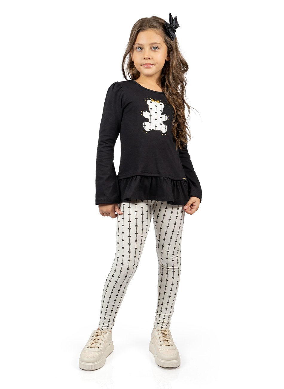 Conjunto Infantil Blusa em Cotton com Strass e Bordado + Legging Estampada Glinny. Feito com materiais de alta qualidade, este conjunto combina conforto e sofisticação para acompanhar as pequenas em qualquer ocasião.