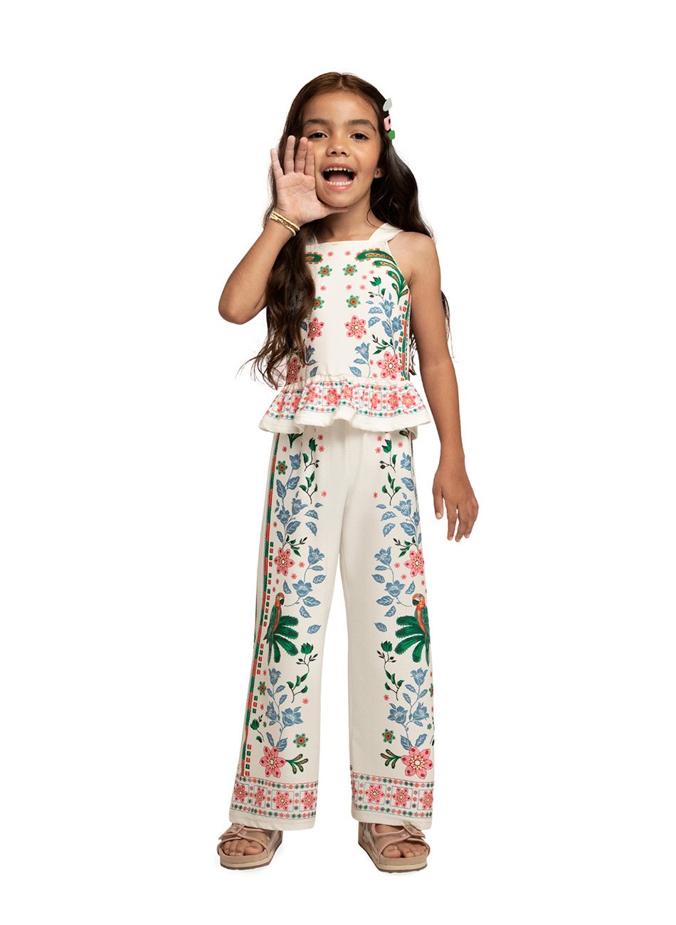 A blusa cropped, com sua estampa rotativa exclusiva, é um destaque do conjunto. O design é enriquecido com alças de regata, que proporcionam um ajuste confortável e permitem liberdade de movimento para brincadeiras e atividades. O detalhe de babado na cintura adiciona um toque de feminilidade e charme à peça, tornando-a ainda mais especial.