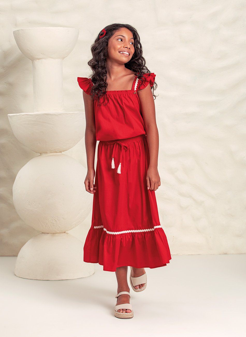 Conjunto Blusa e Saia Midi Infantil Menina da Milli & Nina é a escolha perfeita para um look elegante e cheio de estilo. Feito em tricoline de alta qualidade, o conjunto oferece um conforto incomparável para as pequenas. A blusa conta com babados nas mangas e uma gola reta, conferindo um toque clássico e moderno. A saia midi é o destaque da peça, com um cadáço que ajusta perfeitamente à cintura, e babados na barra que adicionam um movimento delicado ao conjunto. A renda aplicada nos detalhes traz um charme adicional, tornando esta peça ideal para ocasiões especiais.
