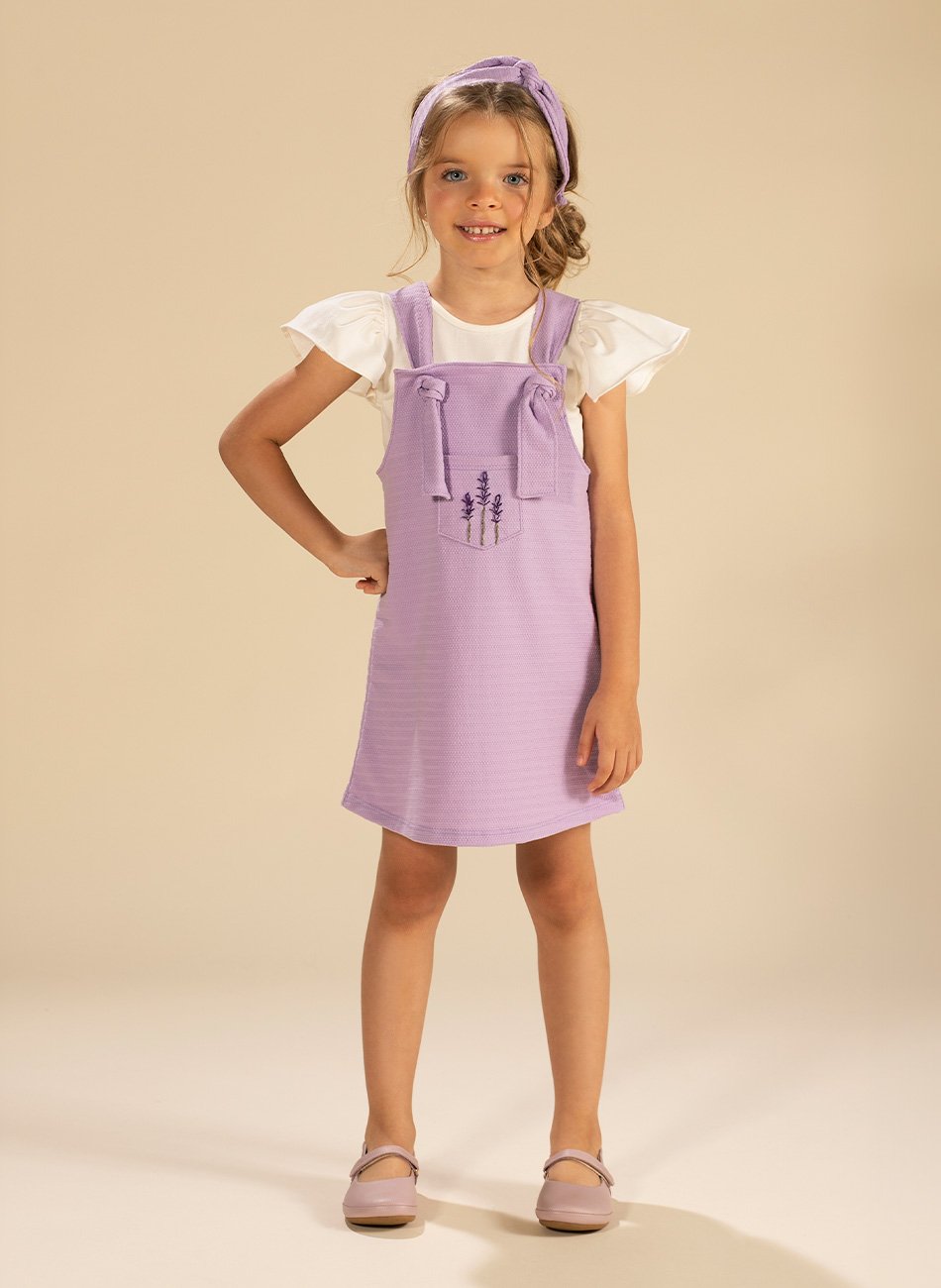A salopete é uma peça versátil e charmosa. Suas alças com amarração em nó permitem ajustá-la perfeitamente ao corpo, proporcionando um caimento ideal. O destaque fica por conta do bolso frontal com bordado manual de ramos de lavanda, que confere um charme extra de fofura e elegância ao conjunto.