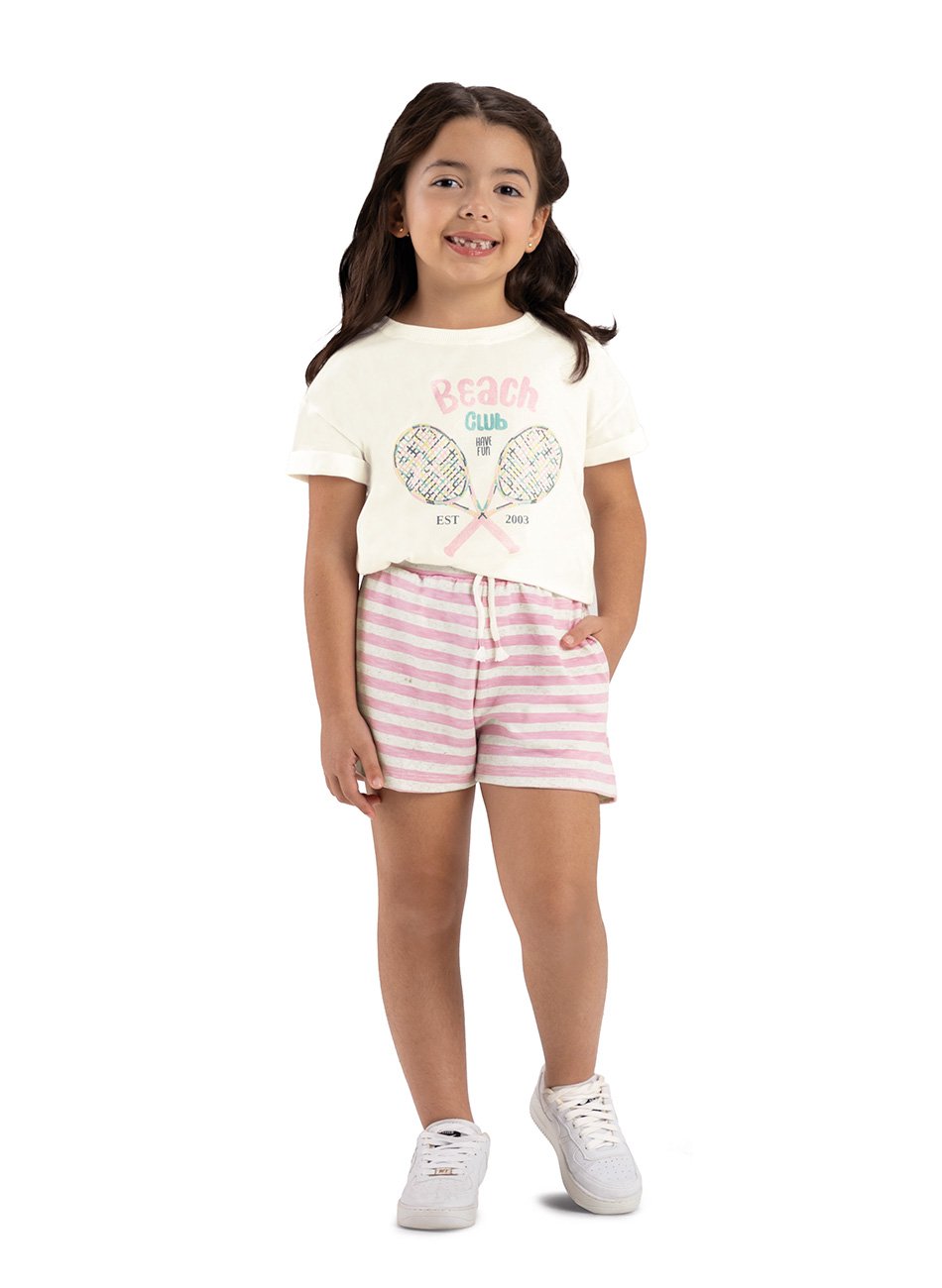 O shorts, confeccionado em moletinho sem felpa, é leve e confortável, com um cadarço na cintura para ajustar perfeitamente ao corpo da criança. A combinação de materiais de alta qualidade garante um visual casual e durável, ideal para o verão e atividades ao ar livre.