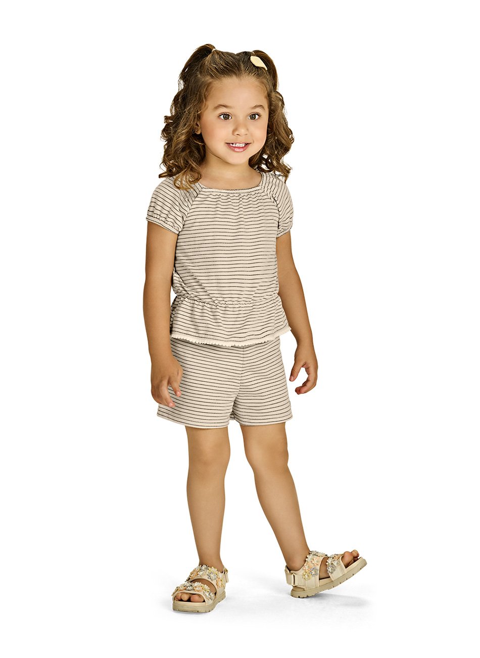 O shorts de meia malha complementa o conjunto com um tecido macio e confortável, garantindo liberdade de movimento para brincadeiras e passeios. Sua modelagem ajustada permite um caimento perfeito, valorizando o estilo sem abrir mão da praticidade.