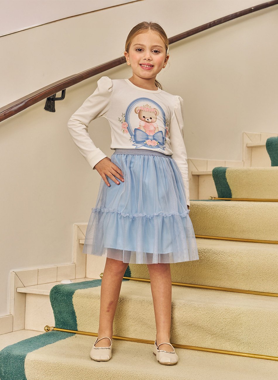 A saia de tule traz uma camada extra de elegância, criando um efeito leve e esvoaçante que combina perfeitamente com eventos especiais, festas e passeios em família. Além disso, os detalhes em lantejoulas na saia tornam o conjunto ainda mais encantador, proporcionando um brilho sutil e delicado.
