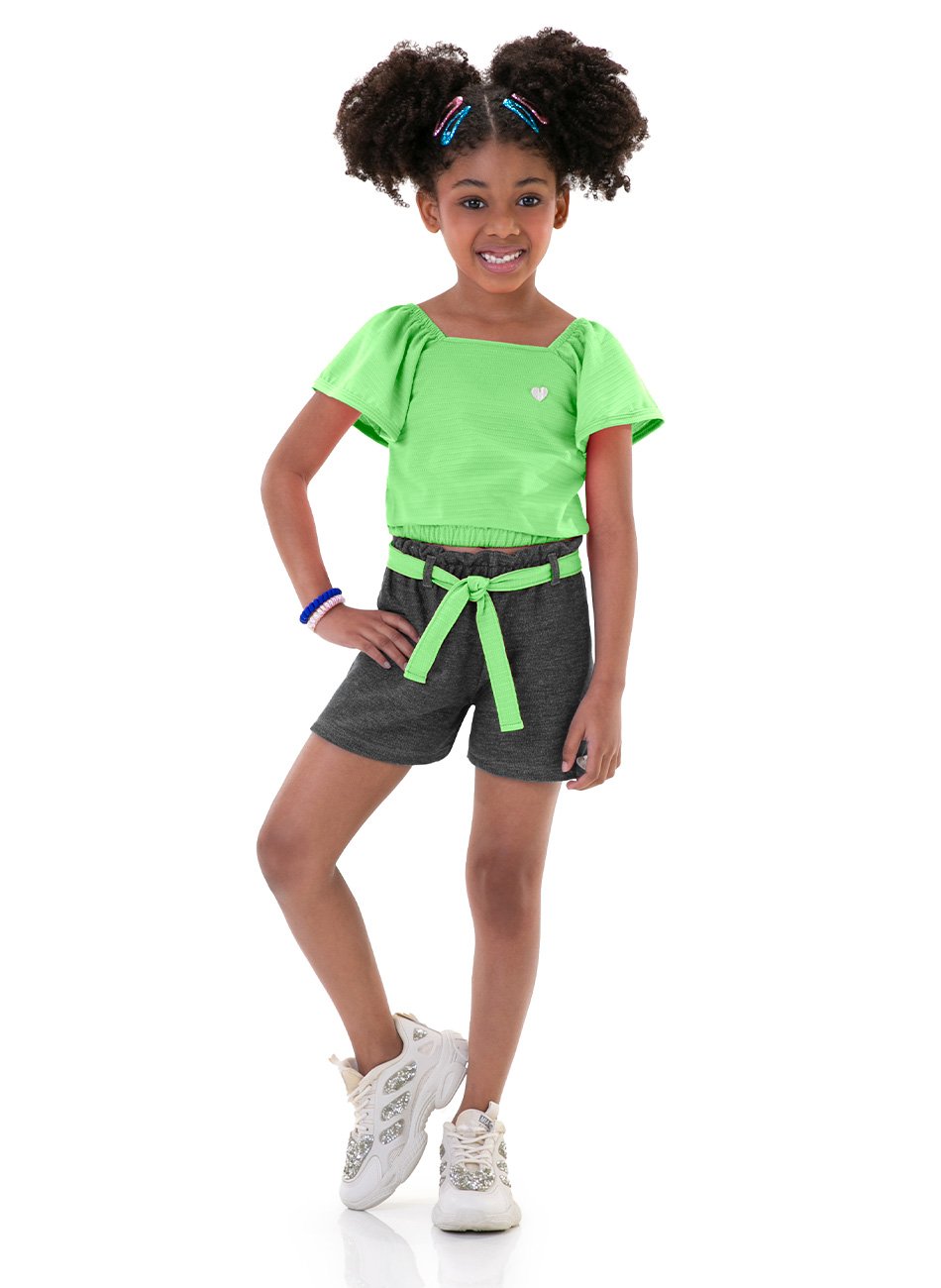 A blusa, confeccionada em cotton, possui uma gola reta que acrescenta um toque de elegância e modernidade ao visual. Sua modelagem proporciona conforto sem perder o estilo, tornando-se uma peça versátil para diversas ocasiões. Já o shorts, feito em moletinho, oferece uma textura macia e confortável, permitindo liberdade de movimento para que as meninas possam brincar e se divertir à vontade.