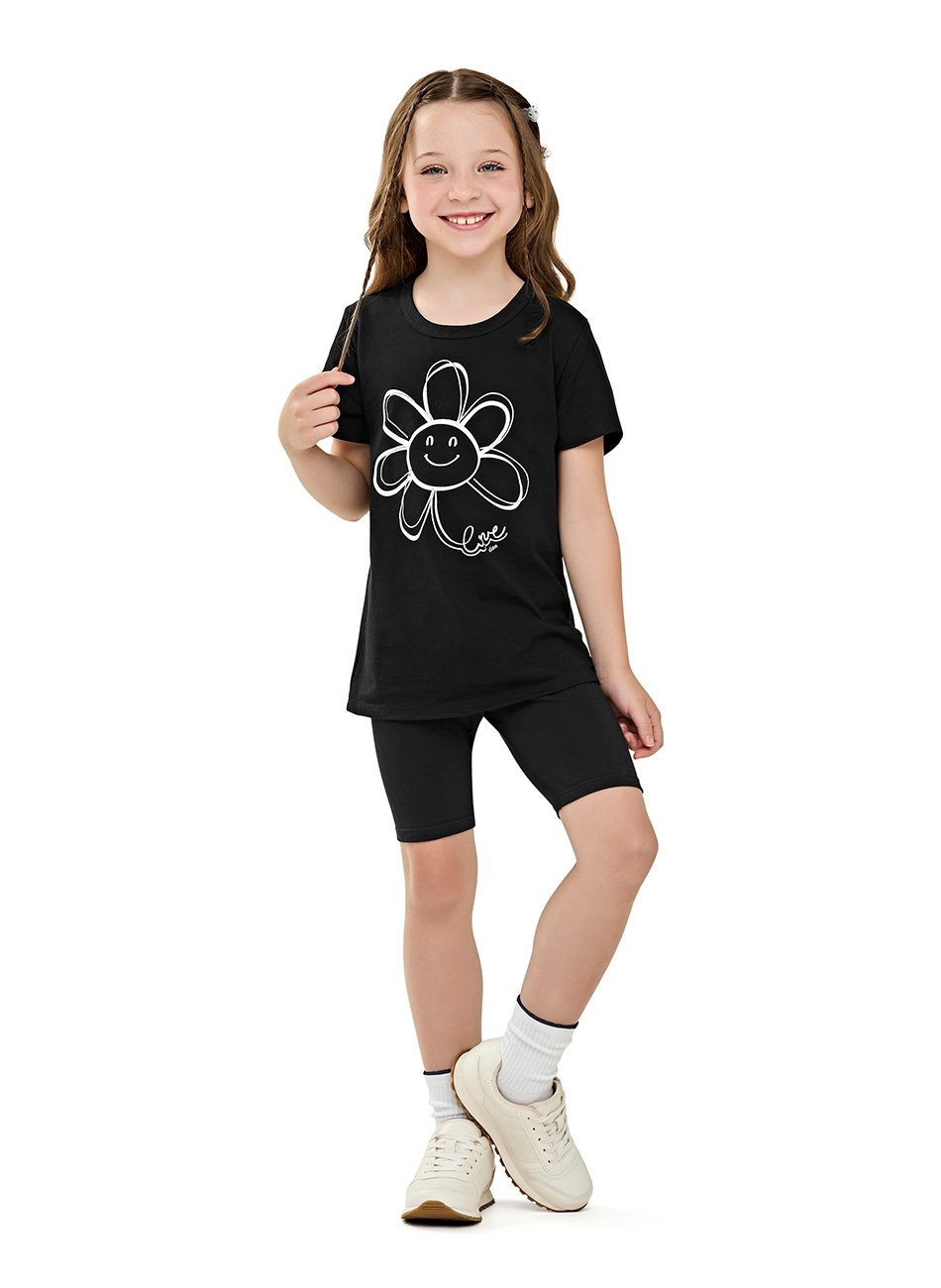 Conjunto Infantil Feminino Elian une conforto e estilo para o dia a dia das pequenas! Composto por uma blusa de meia malha macia e respirável e um shorts ciclista confortável, essa combinação é ideal para momentos de diversão e passeios.