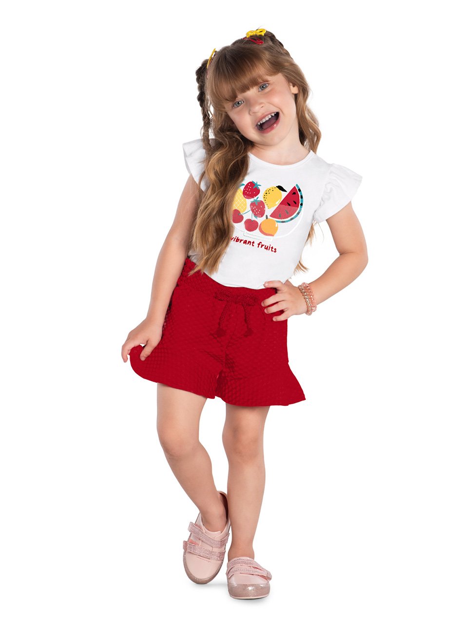 O Conjunto Infantil Menina Kyly é a escolha perfeita para as pequenas que adoram se vestir com conforto e estilo. Composto por uma blusa charmosa em meia malha e um shorts em malha trabalhada, este conjunto combina praticidade e um toque de fofura para o dia a dia das crianças. A blusa é confeccionada 100% em algodão, um material leve e respirável, ideal para garantir o bem-estar durante as brincadeiras. Seu destaque fica por conta das frutas aplicadas em tule que formam uma divertida fruteira, trazendo um visual alegre e delicado que encanta. Com decote redondo, acabamento em debrum, mangas com franzido e barra com bainha, cada detalhe foi pensado para proporcionar um caimento impecável.