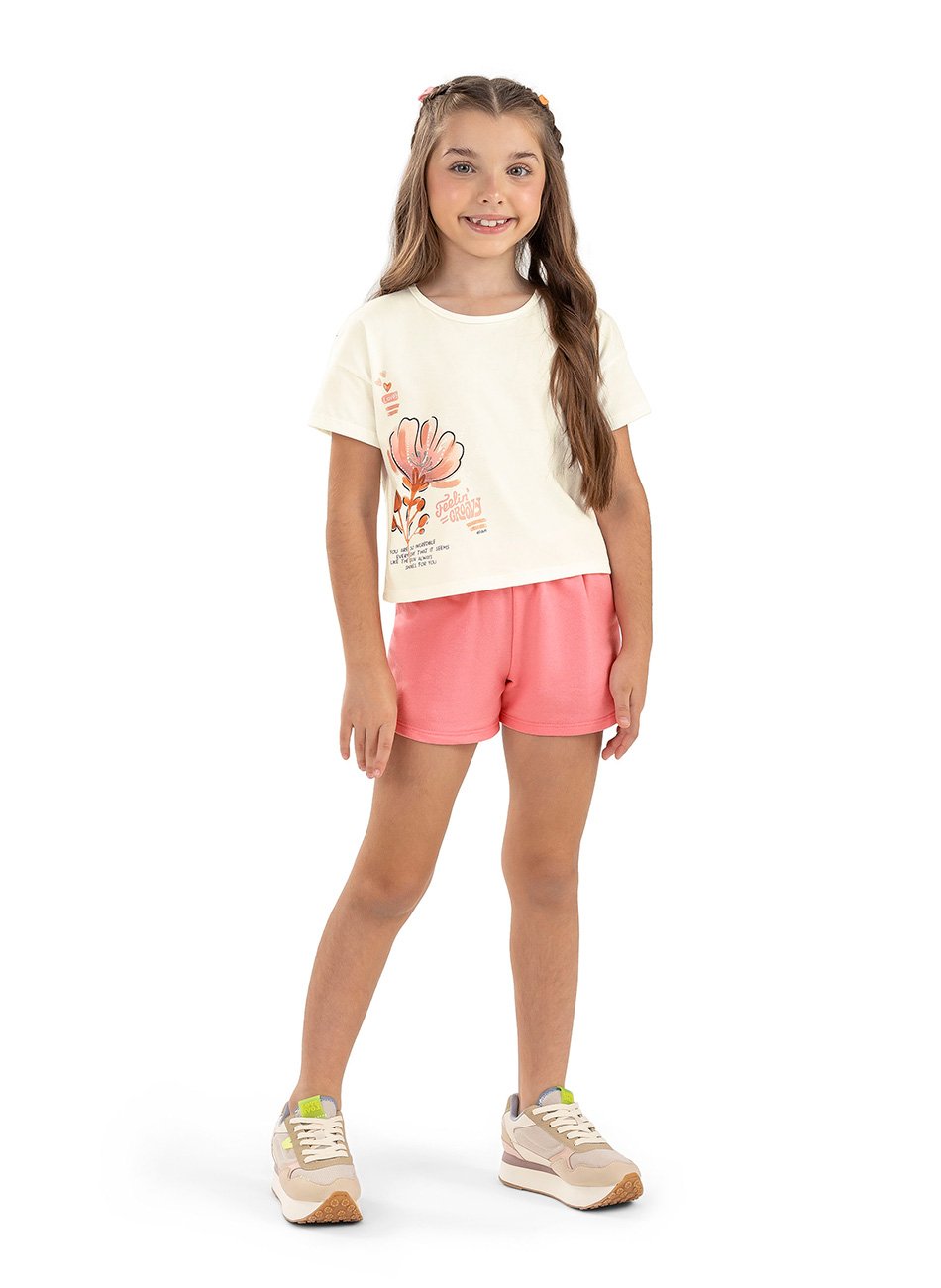 A blusa apresenta uma estampa frontal encantadora, que agrega um toque divertido e cheio de personalidade ao look. Já o short em moletom proporciona liberdade de movimento e um caimento confortável, sendo perfeito para brincadeiras e passeios ao ar livre.