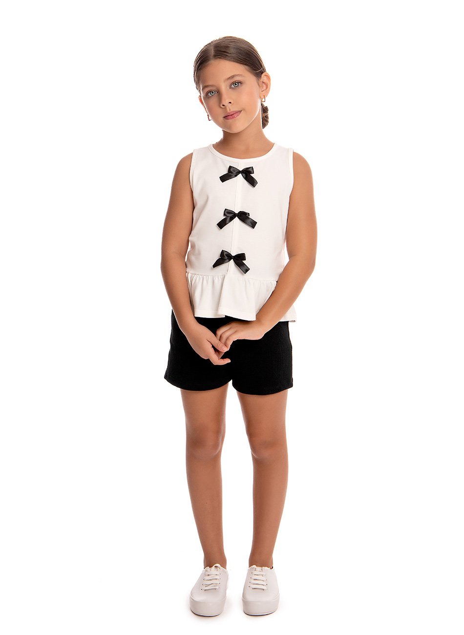 A blusa, com toque suave e ótima respirabilidade, traz em destaque os laços aplicados na parte frontal, que adicionam um toque delicado e encantador à peça. Seu design é ideal para compor looks leves para passeios, escola ou encontros em família. A modelagem confortável permite que a criança se movimente livremente sem abrir mão da elegância.