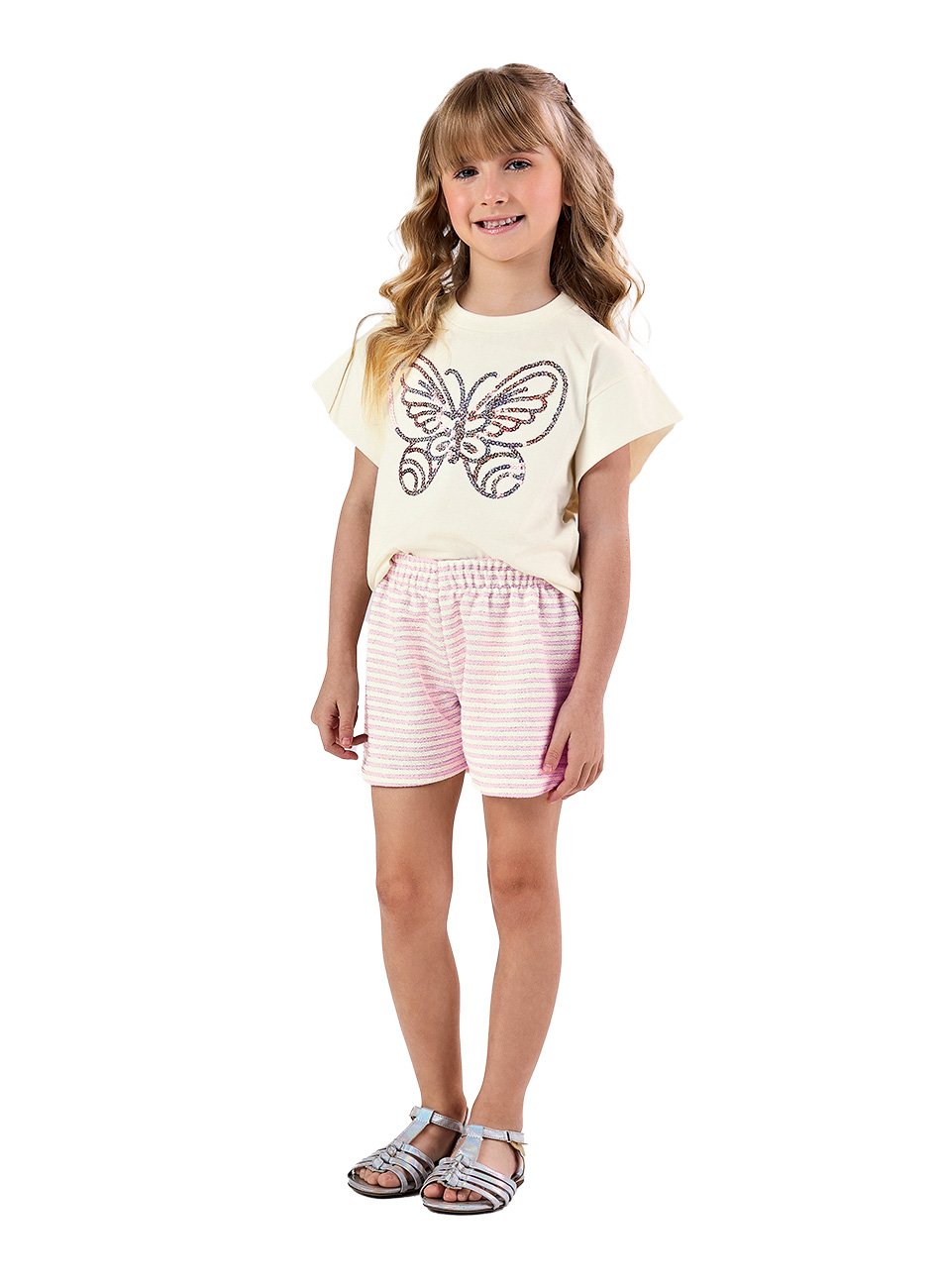 Já o shorts em moletinho complementa o visual com uma estampa rotativa listrada, moderna e divertida. Feito em tecido maleável e fresquinho, ele garante total liberdade de movimentos, ideal para momentos de lazer, passeios ou dias na escola. A estampa listrada, além de atual, traz um ar alegre e descontraído à produção.