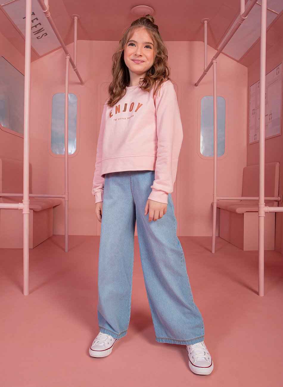Conjunto Infantil para Meninas, composto por uma blusa de moletom peluciado e uma calça jeans wide leg.