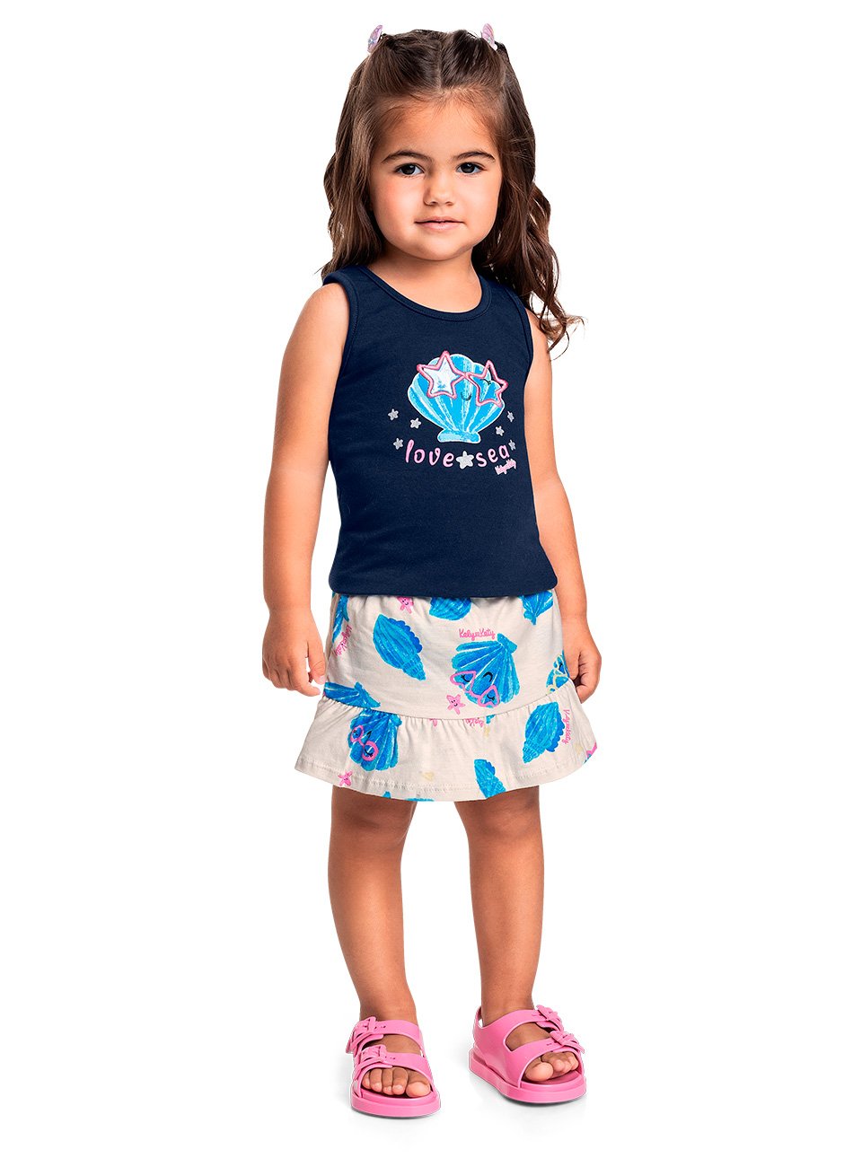 Conjunto Infantil Menina Kely Kety é a escolha perfeita para mães que buscam praticidade sem abrir mão do estilo para suas filhas. Composto por uma blusa em meia malha com uma estampa frontal divertida e um shorts saia com estampa rotativa, este conjunto oferece conforto e um visual moderno, ideal para o uso diário.