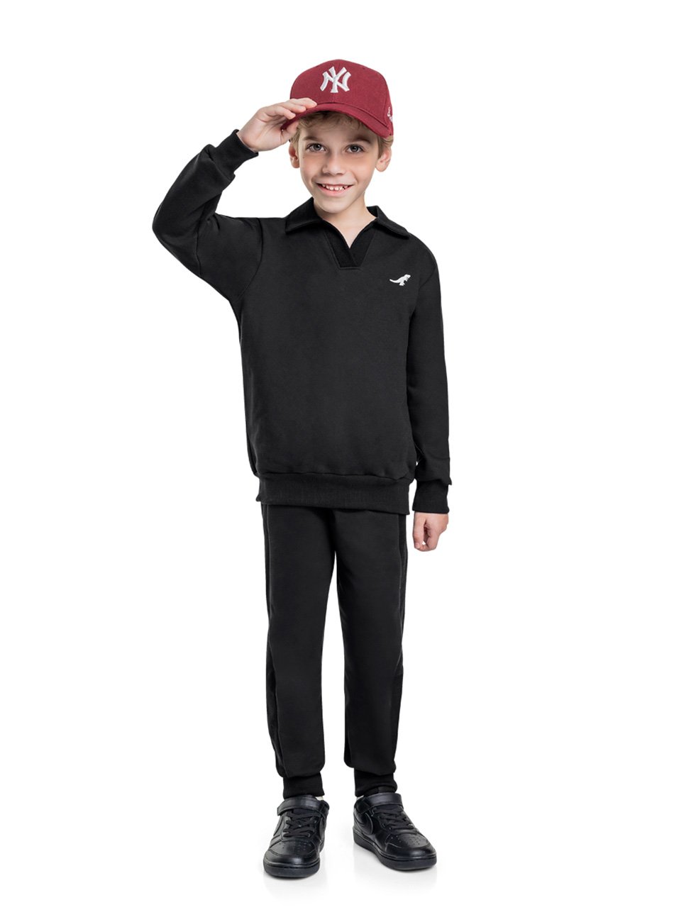 O blusão é o destaque com seu design moderno e detalhe estiloso na gola, que traz um toque diferenciado ao visual. Já a calça é confeccionada em moletinho sarjado rústico, um tecido que combina resistência e conforto, proporcionando um ajuste ideal para o uso diário.