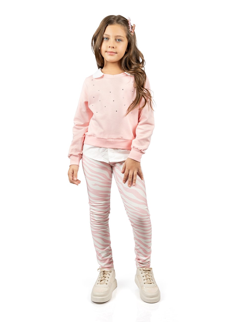 O blusão possui uma gola em tricoline que adiciona um toque de elegância à peça, além de detalhes em strass que trazem um brilho delicado e sofisticado. A legging, confeccionada em molecotton, conta com uma estampa rotativa divertida e colorida, garantindo conforto e liberdade de movimentos para as brincadeiras e atividades do dia a dia.