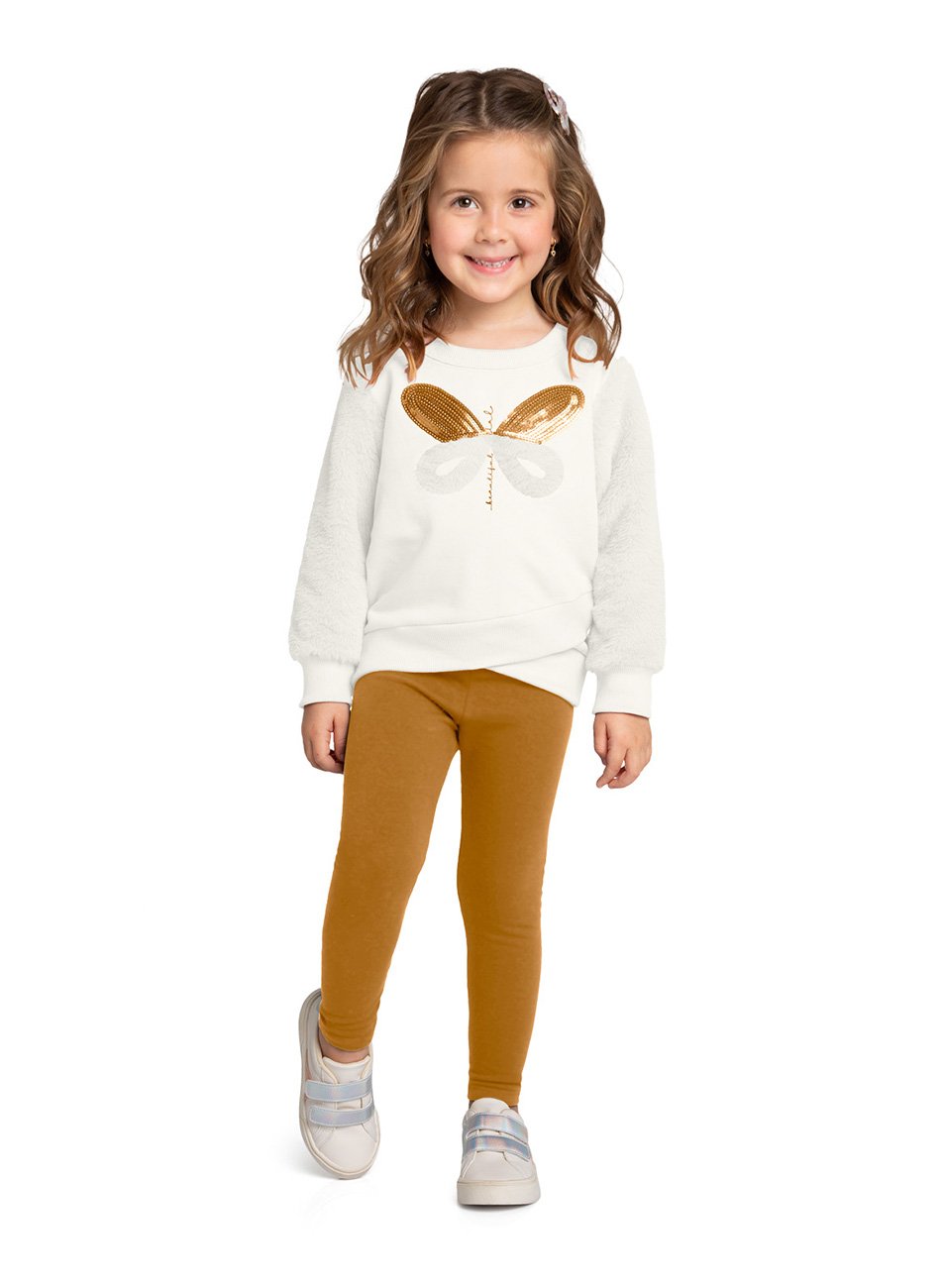 A legging é feita em molecotton com felpa interna, garantindo proteção térmica nos dias frios. Seu tecido contém elastano, proporcionando ajuste perfeito ao corpo e total liberdade de movimento para as pequenas brincarem com conforto.