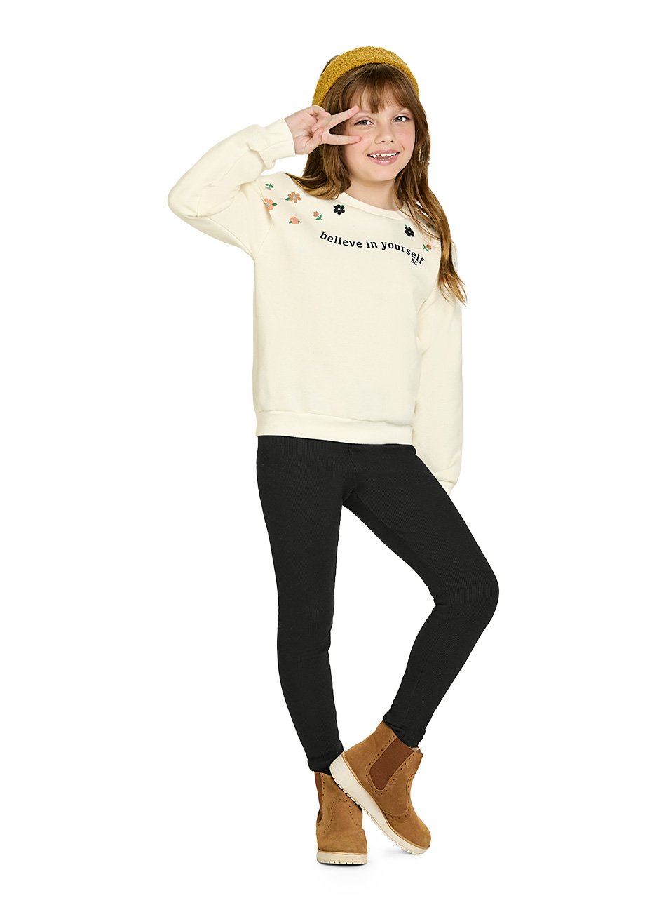 Estamparia: Estampa frontal com aplicação de Glitter, adicionando brilho e destaque à peça.