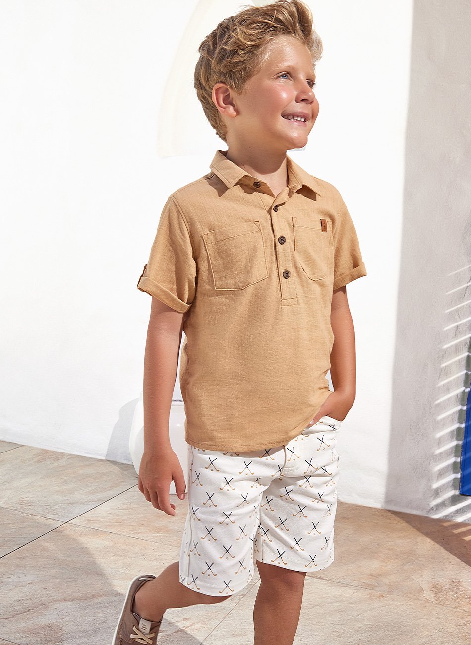 Bermuda em Sarja com Estampa Rotativa: A bermuda em sarja é projetada para oferecer um ajuste confortável e flexível, permitindo que seu filho se mova livremente. A estampa rotativa confere um visual moderno e atraente, tornando a bermuda uma peça versátil que combina com diferentes camisas e acessórios.