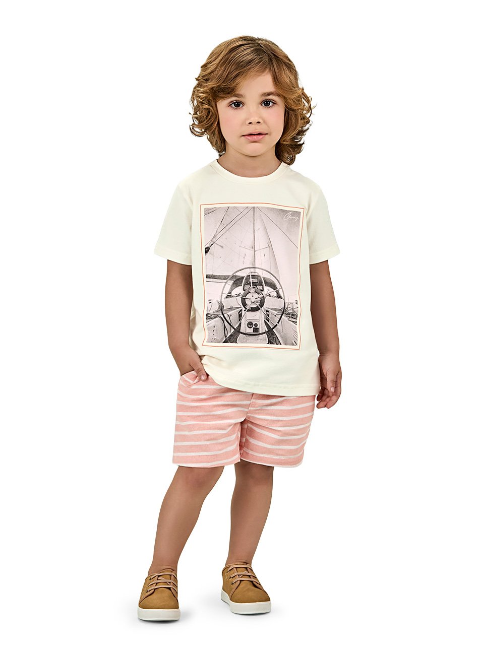 Já a bermuda em sarja é um item essencial para o guarda-roupa infantil, sendo resistente e com um visual supermoderno. A estampa rotativa da bermuda traz um detalhe diferenciado, tornando o conjunto ainda mais fashion e cheio de personalidade.