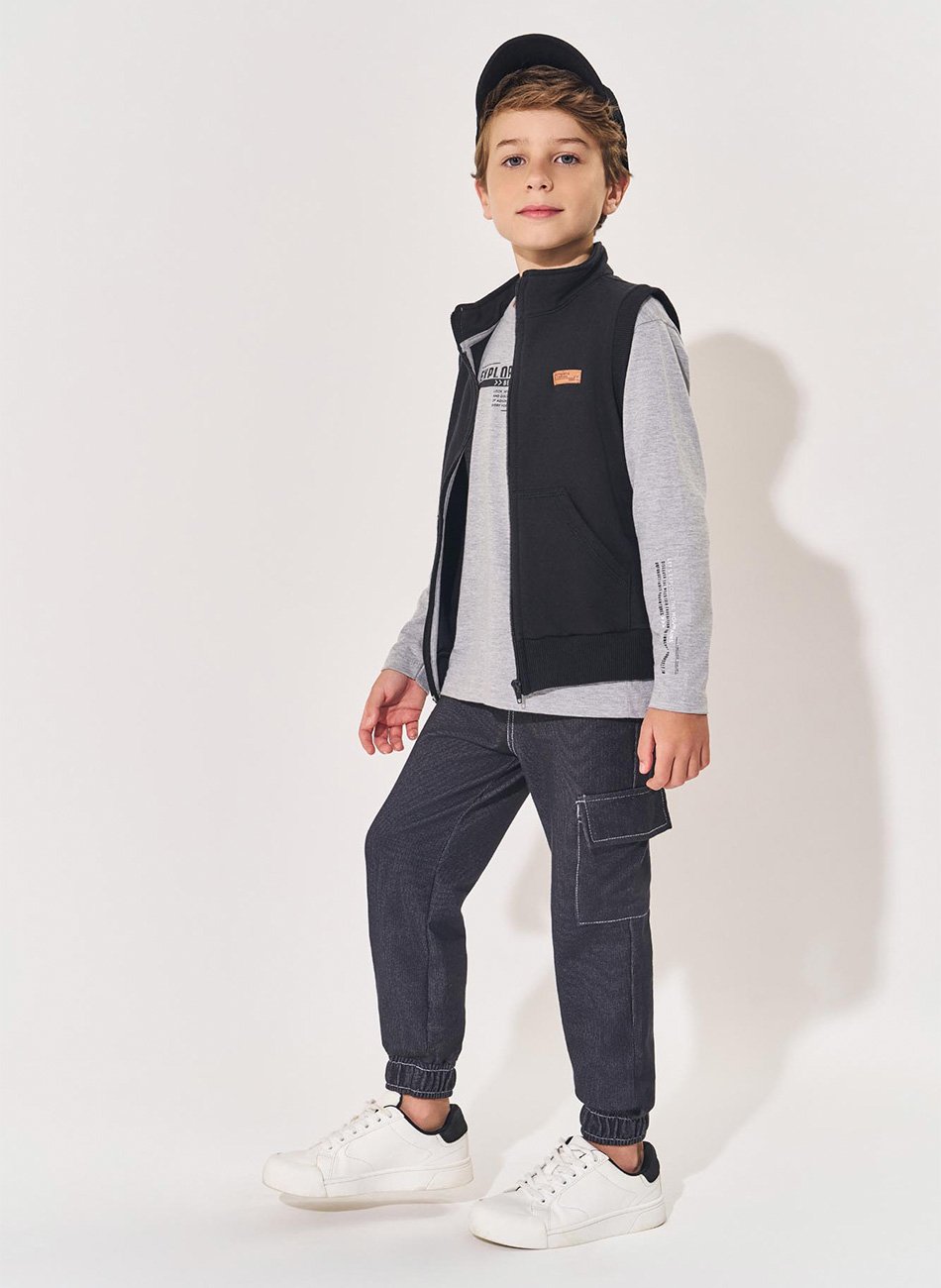 A camiseta de meia malha possui uma estampa frontal divertida que agrega charme ao visual, enquanto as mangas longas garantem proteção extra nos dias mais frios. O colete de moletom é equipado com um zíper prático para fácil ajuste e bolsos frontais que oferecem conveniência para guardar pequenos objetos. A calça de molecotton conta com um cadarço funcional que permite um ajuste seguro e confortável, além de bolsos laterais que adicionam praticidade ao conjunto.