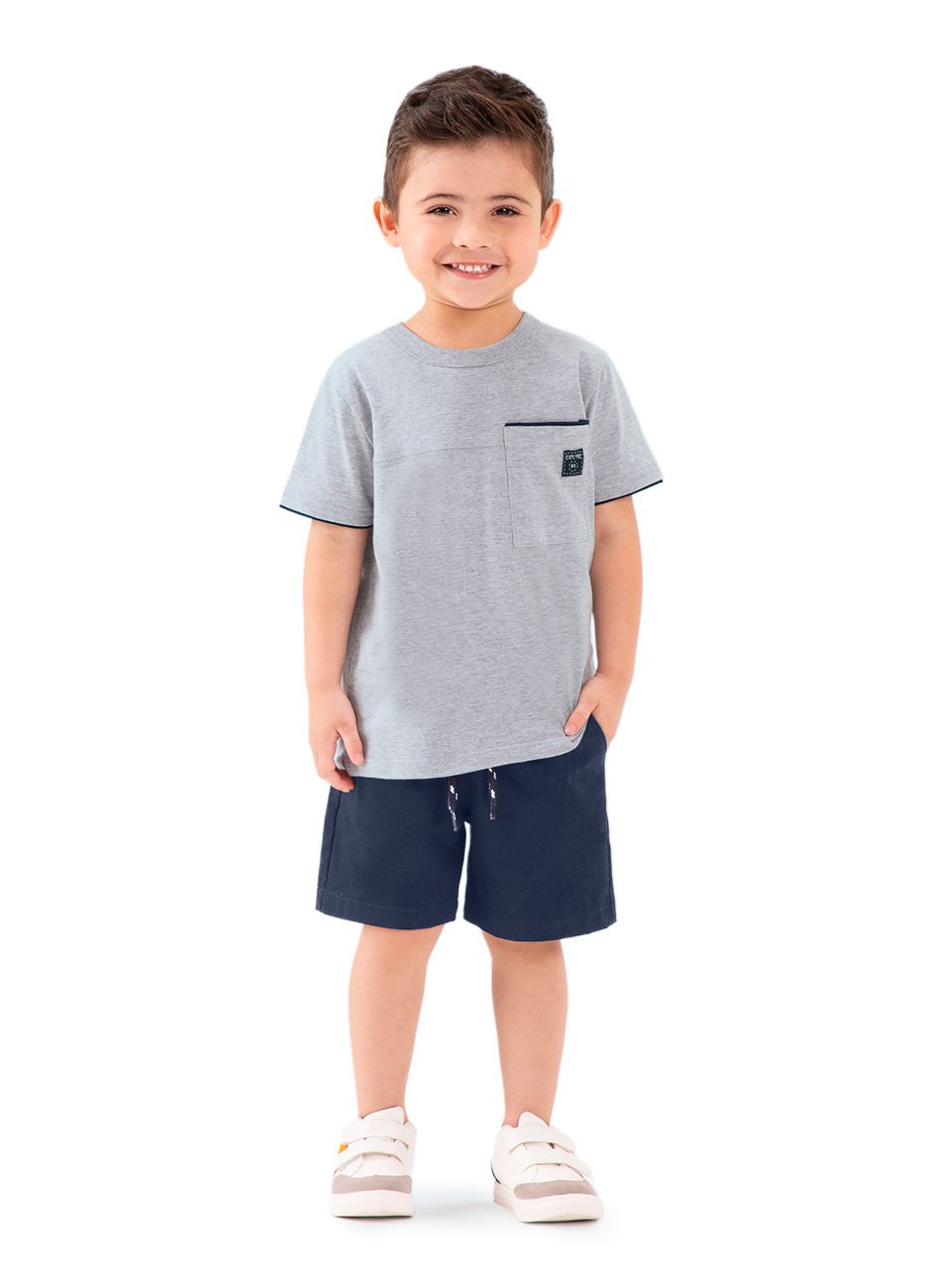 A bermuda, por sua vez, é o complemento ideal para esse look casual. Com cadarço decorativo na cintura, ela transmite uma pegada esportiva e moderna. Além disso, possui bolsos laterais funcionais, perfeitos para guardar pequenos objetos ou até mesmo as descobertas das brincadeiras. A modelagem é confortável, com ótimo caimento e espaço para que os meninos se movimentem à vontade.