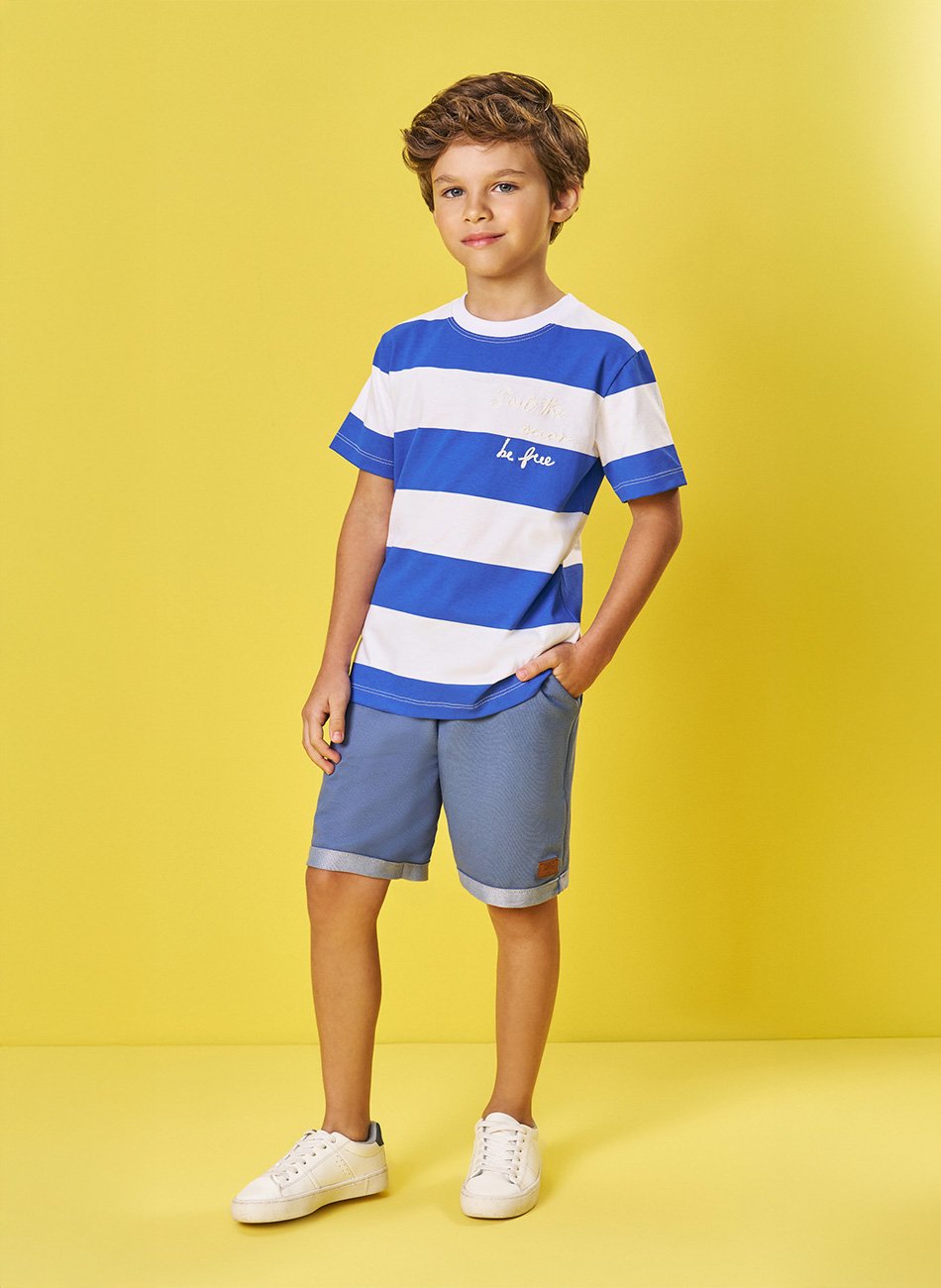 Bermuda em molecotton denim é o destaque do conjunto. Seu tecido é macio e flexível, proporcionando conforto durante todo o dia.