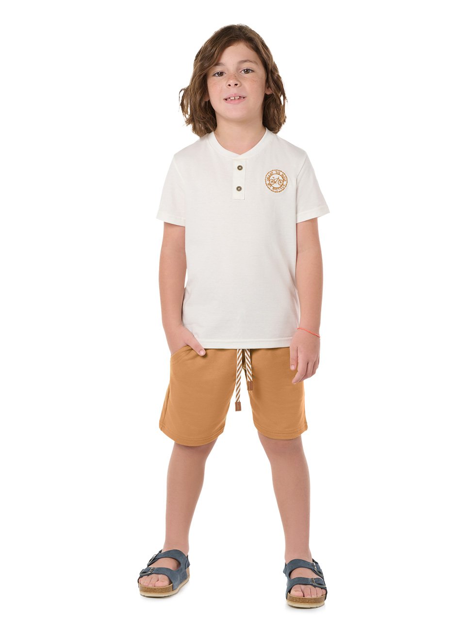 A bermuda em moletom apresenta detalhes de cadarço com ponteiras, permitindo um ajuste perfeito e um toque moderno. Para maior praticidade e funcionalidade, a bermuda também conta com bolsos laterais, ideais para armazenar pequenos objetos enquanto seu filho se diverte.