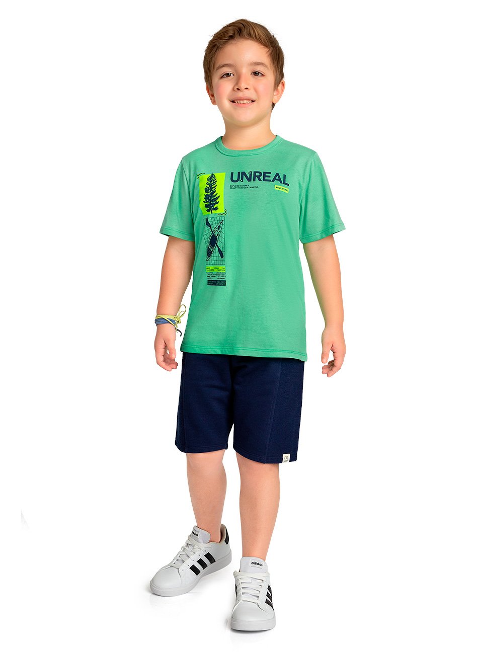 A camiseta possui uma estampa frontal exclusiva que adiciona um toque divertido e estiloso à peça. Confeccionada em meia malha penteada, ela oferece maciez e conforto à pele, sendo perfeita para o uso diário. A bermuda de moletinho é extremamente confortável e permite liberdade de movimentos, ideal para as brincadeiras e atividades do dia a dia.