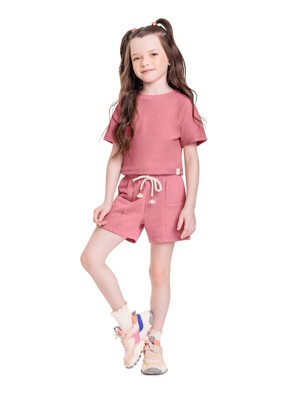 A blusa possui um design clean, sem estampas, o que facilita as combinações com outras peças e acessórios, tornando-se uma peça curinga no guarda-roupa infantil. Já o short é prático e moderno, com cadarço fake na cintura que adiciona um toque de charme sem comprometer o conforto. Os bolsos frontais são ideais para carregar pequenos itens e adicionar um detalhe funcional ao look.