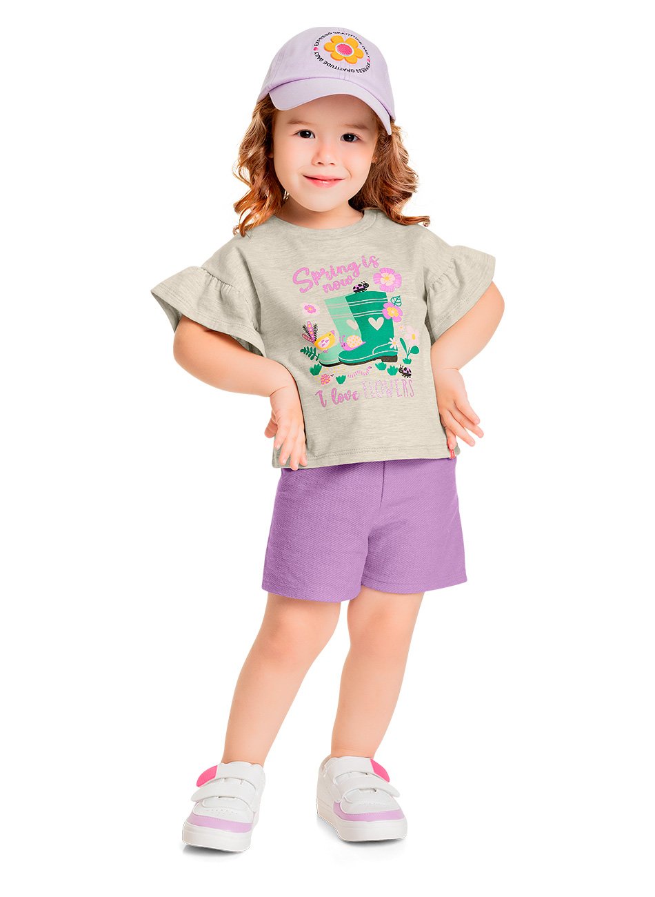 Para complementar o visual, o shorts em moletom sem felpa traz um toque rústico e despojado, perfeito para dias de lazer. O tecido estilo sarjado proporciona um acabamento robusto, mas ao mesmo tempo confortável, oferecendo flexibilidade e liberdade de movimento para que as meninas possam brincar com total conforto. Esse conjunto foi criado para ser versátil, confortável e ideal para diferentes atividades, desde passeios até momentos casuais.