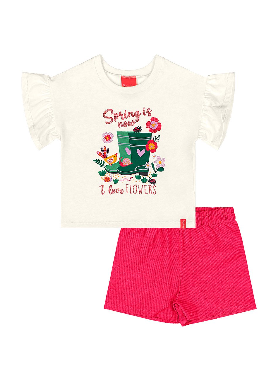 Para complementar o visual, o shorts em moletom sem felpa traz um toque rústico e despojado, perfeito para dias de lazer. O tecido estilo sarjado proporciona um acabamento robusto, mas ao mesmo tempo confortável, oferecendo flexibilidade e liberdade de movimento para que as meninas possam brincar com total conforto. Esse conjunto foi criado para ser versátil, confortável e ideal para diferentes atividades, desde passeios até momentos casuais.