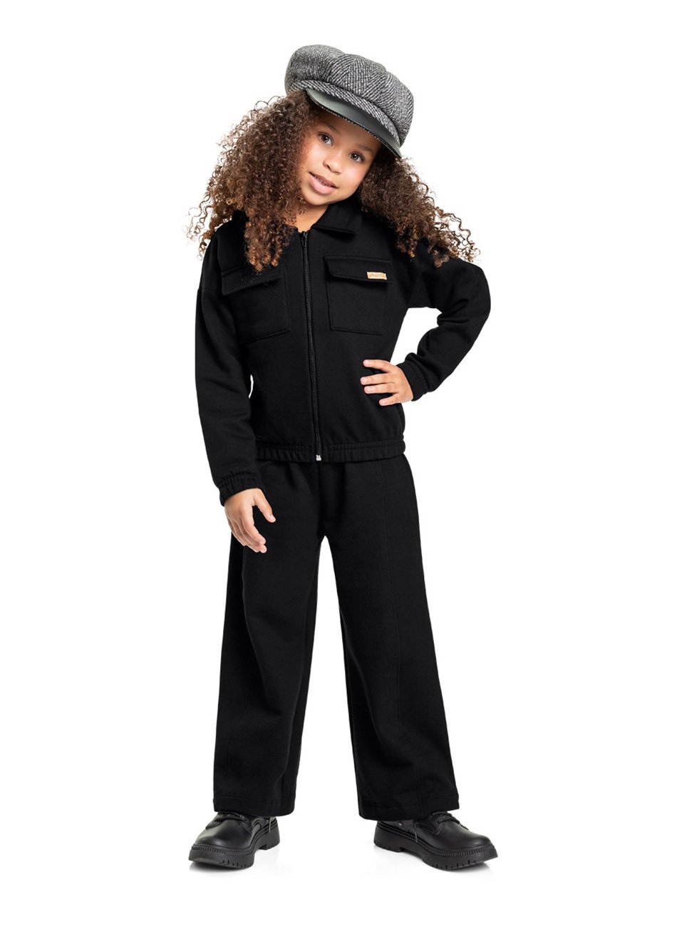 Este conjunto é a definição de estilo e conforto para as pequenas princesas. A jaqueta, confeccionada em moletom com peluciamento interno, apresenta bolsos sobrepostos com detalhe em lapela, além de elástico na barra e mangas, proporcionando um ajuste perfeito. A calça, com modelagem reta e ampla, oferece praticidade com elástico no cós e um toque especial com bordado na barra. Ideal para ocasiões especiais ou para compor looks cheios de charme no dia a dia das meninas.
