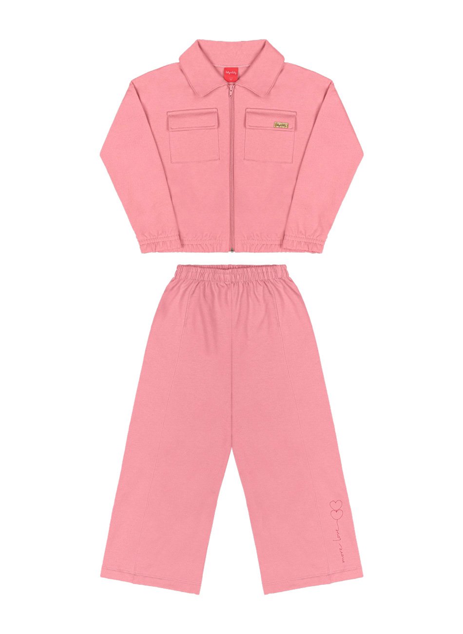Este conjunto é a definição de estilo e conforto para as pequenas princesas. A jaqueta, confeccionada em moletom com peluciamento interno, apresenta bolsos sobrepostos com detalhe em lapela, além de elástico na barra e mangas, proporcionando um ajuste perfeito. A calça, com modelagem reta e ampla, oferece praticidade com elástico no cós e um toque especial com bordado na barra. Ideal para ocasiões especiais ou para compor looks cheios de charme no dia a dia das meninas.