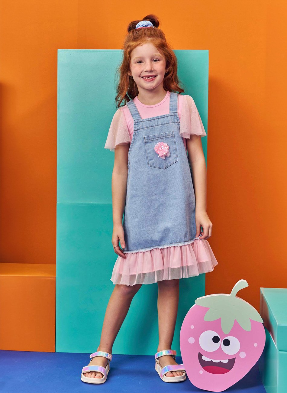 Descubra o encantador Conjunto Kukie, composto por uma blusa canelada e uma salopete em jeans Arkansas com detalhes em tule. Este conjunto é a escolha perfeita para meninas que buscam conforto e estilo em uma única peça. A blusa canelada é adornada com tule nas mangas e delicados strass, conferindo um toque de sofisticação e brilho. A salopete em jeans apresenta um bolso frontal decorado com um mini buquê de lantejoulas e um laço com uma pérola branca, agregando um charme especial. A barra da salopete também é embelezada com tule, proporcionando um visual delicado e elegante.