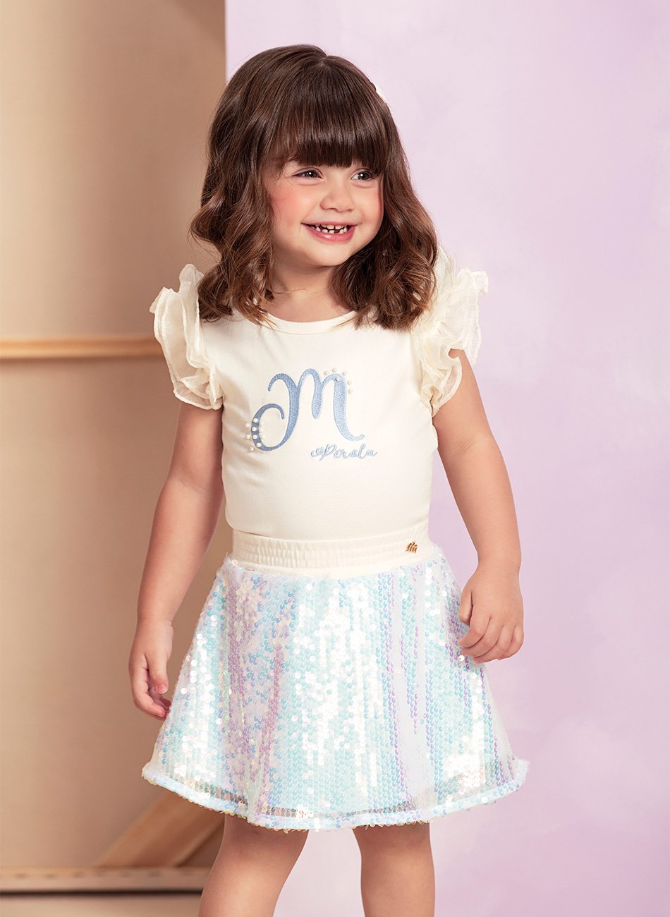A saia é um verdadeiro destaque com seu tecido em paetê que brilha e chama atenção. Além disso, a saia possui um forro interno que garante conforto e um toque suave na pele da criança. O short embutido é um detalhe prático e funcional, proporcionando liberdade de movimento e segurança para brincar à vontade.