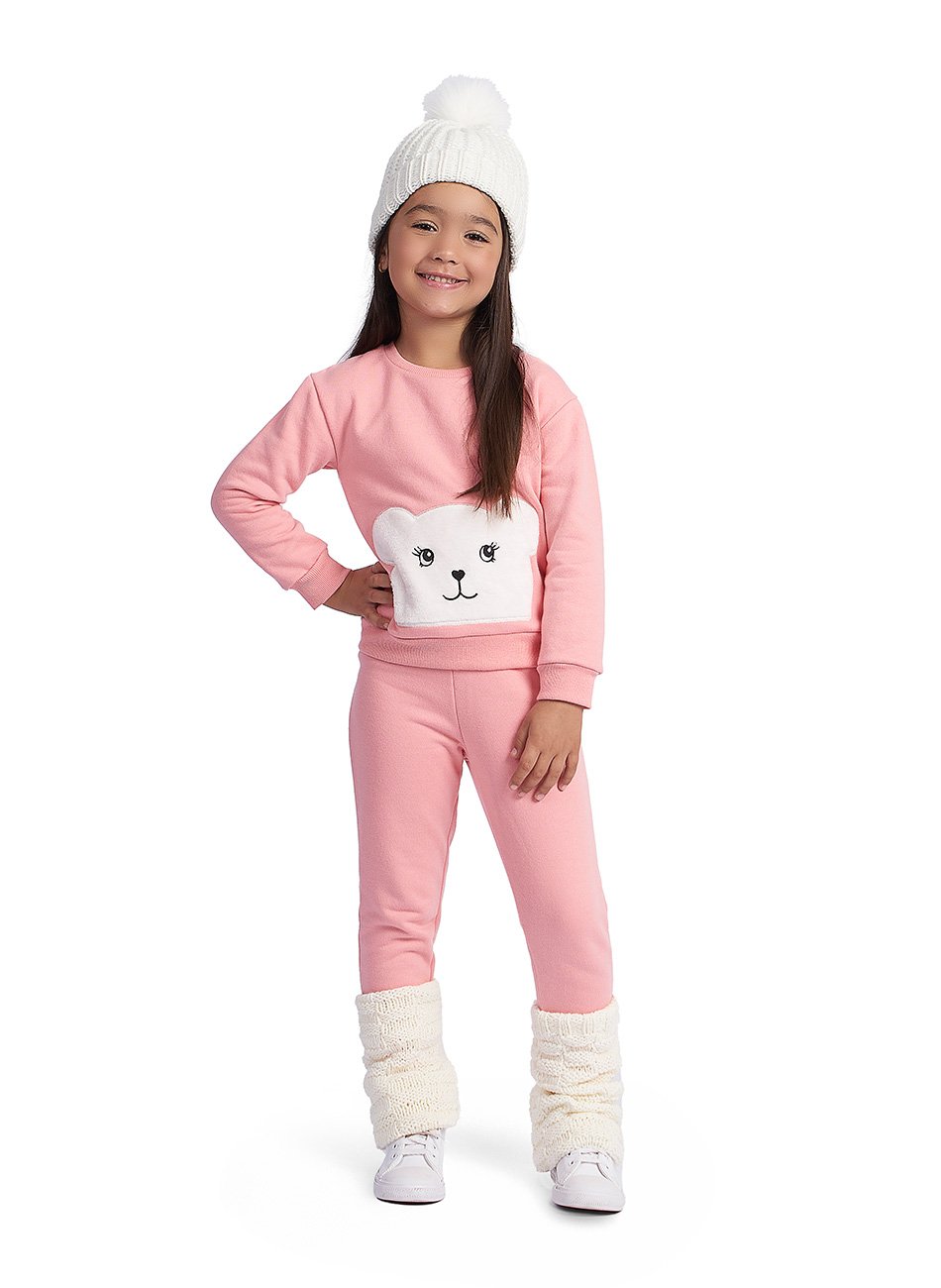 Conjunto infantil para meninas, confeccionado em moletom macio e confortável. A blusa possui ribana nos punhos e um adorável aplique de urso bordado em pelos. A calça também é em moletom, proporcionando conforto durante todo o dia, com ribana para um ajuste perfeito. Ideal para manter sua pequena estilosa e aquecida em dias frescos.