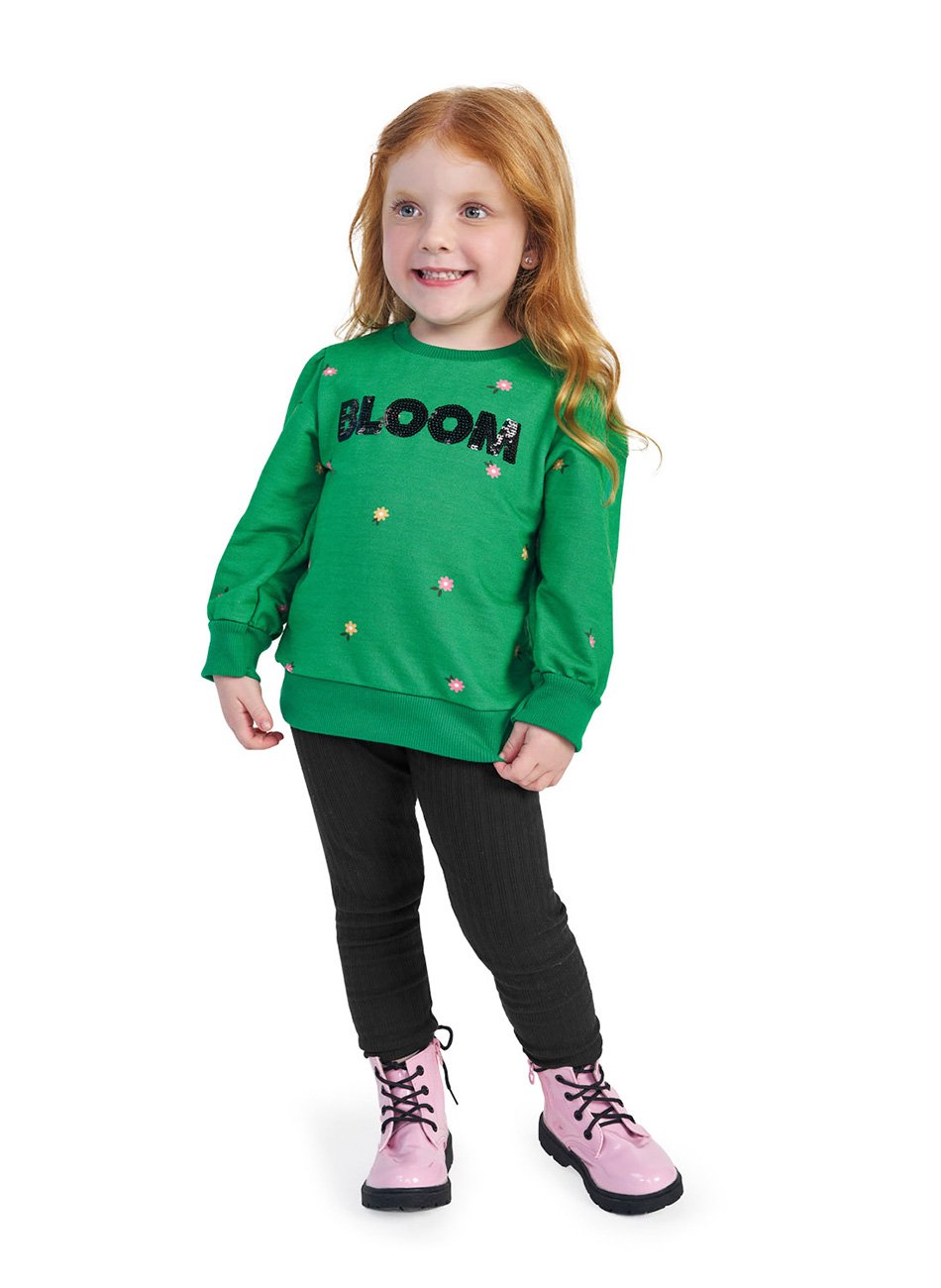 O casaco, confeccionado em moletom peluciado 100% algodão, oferece maciez e calor nos dias mais frescos. Destaca-se pela estampa de flores e pela escrita "Bloom" (Florescer), com apliques de lantejoulas na escrita, proporcionando um toque de brilho e estilo ao conjunto. O decote redondo com debrum, as mangas com ombros franzidos e o acabamento em molde nos punhos e na barra garantem um visual charmoso e elegante.