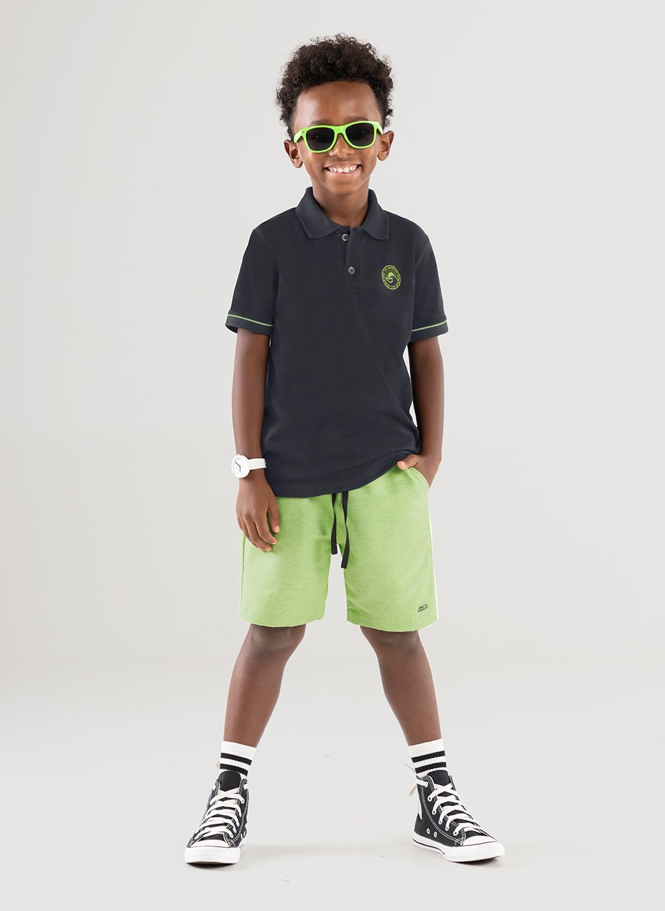 A polo apresenta uma gola clássica que confere um ar sofisticado ao conjunto, mantendo-se confortável e fresca, graças ao tecido leve de meia malha. A bermuda de sarja complementa o visual com um toque despojado e funcional. O cadarço ajustável na cintura permite um ajuste perfeito e seguro, garantindo o conforto durante todo o dia.